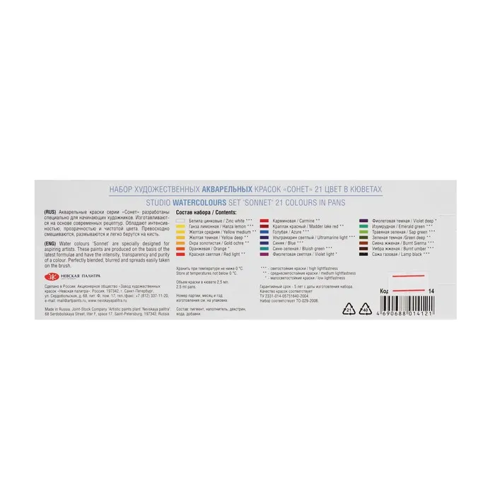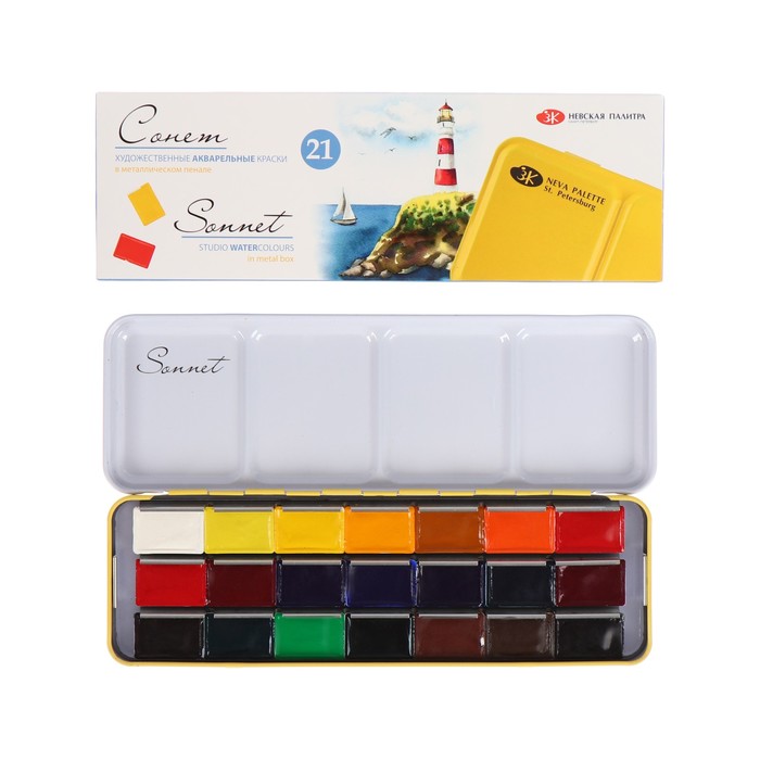 Художественные акварельные краски "Сонет" разработаны для начинающих художников, открывающих или совершенствующих свои творческие способности. Изготавливаются по современным рецептурам на основе преимущественно органических пигментов и синтетического связующего. Обладают интенсивностью цвета и прозрачностью. Превосходно смешиваются, размываются и легко берутся на кисть.