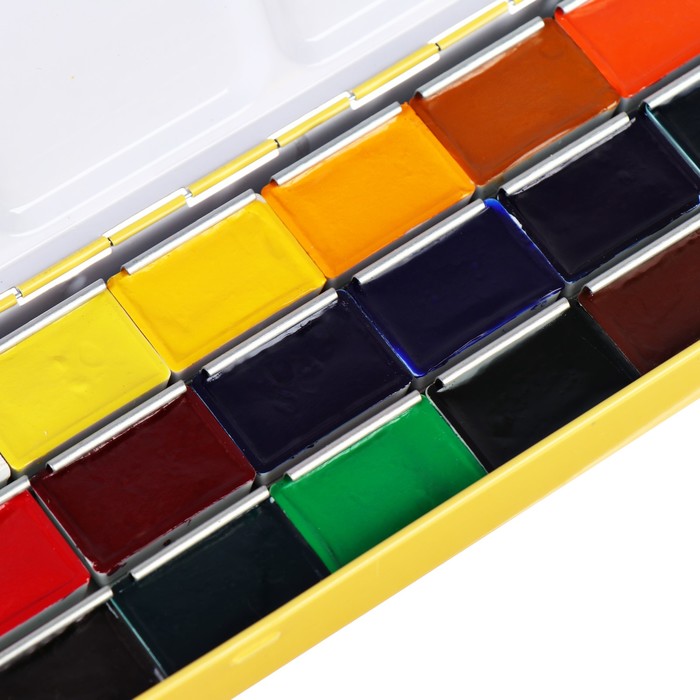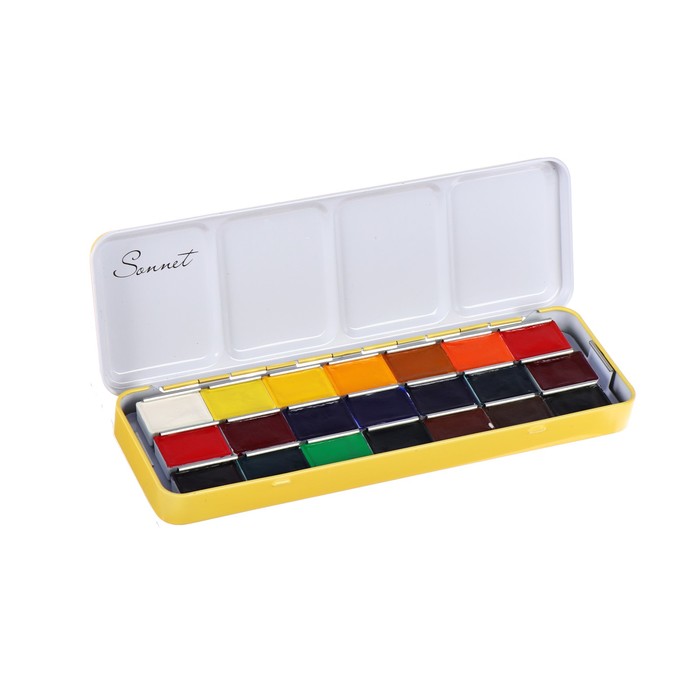 Набор состоит из 21 цвета, кюветы расположены в удобном металлическом пенале. Крышку пенала можно использовать в качестве палитры для смешивания красок. Пенал так же оснащён специальным кольцом держателем для удобства работы на пленэре.