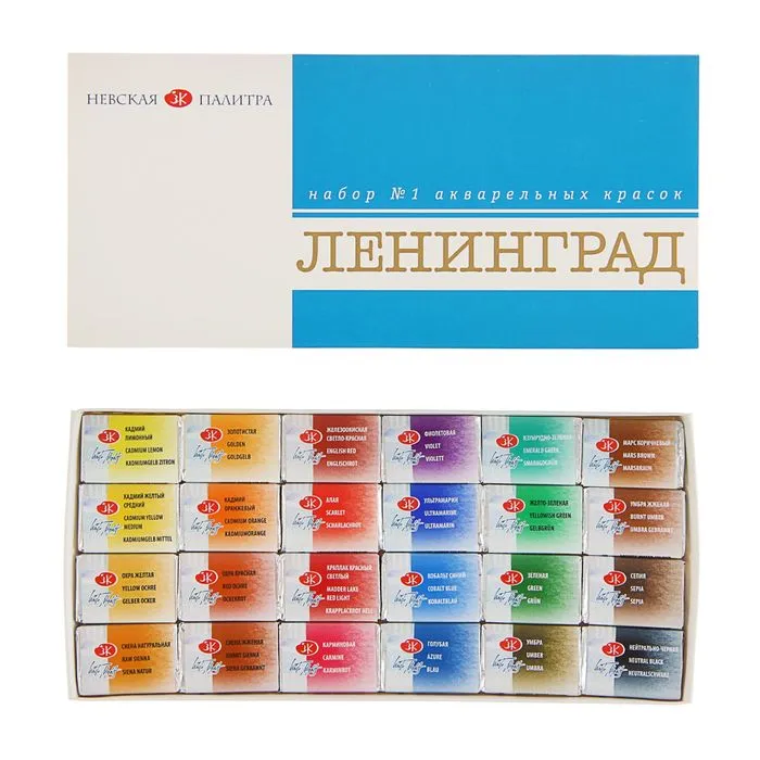 Традиционный набор "Ленинград" в ретро-дизайне знаком нескольким поколениям художников. Сбалансированная палитра состоит из 24 цветов акварели "Белые ночи", позволяющих решить множество творческих задач. Набор представлен в классической картонной коробке. Профессиональные художественные акварельные краски "Белые ночи" представляют собой тонкодисперсные суспензии пигментов и наполнителей в связующем, в состав которого входит водный раствор растительного клея – гуммиарабика. Все акварельные краски в палитре "Белые ночи" безопасны, сертифицированы и соответствуют стандартам ASTM D-4236. Высокая концентрация пигмента обеспечивают максимальную интенсивность цветового тона акварели. Насыщенность сохраняется даже при разбавлении большим количеством воды. Отличаются прозрачностью, что дает возможность художнику работать тонкими лессировками. Чистые цвета позволяют писать в смесях и получать богатое многообразие оттенков. Основная часть красок обладает высочайшим показателем светостойкости, что способствует сохранности работ свыше 100 лет. Все это обеспечивает их высокое качество и возможность использования в ответственных работах.