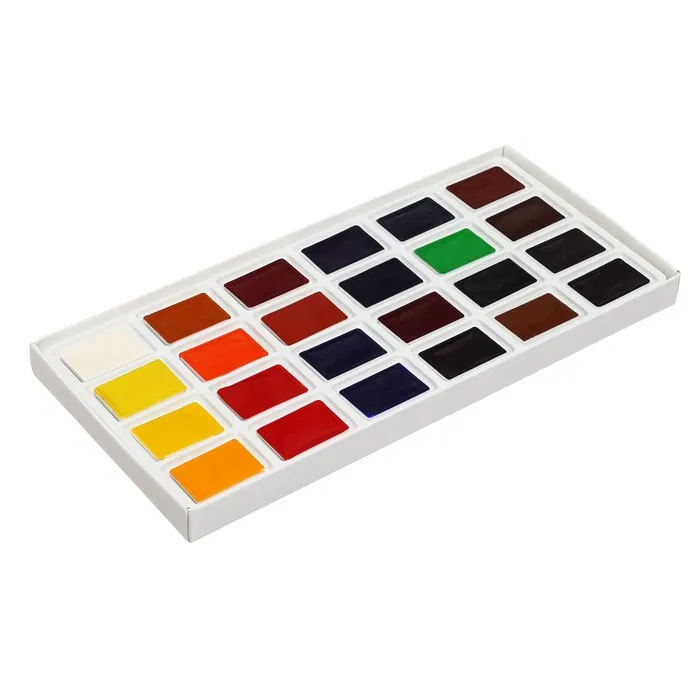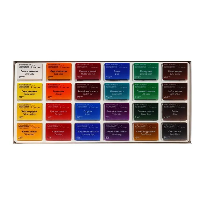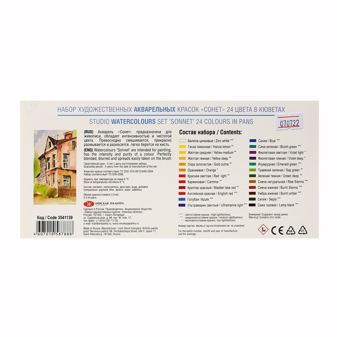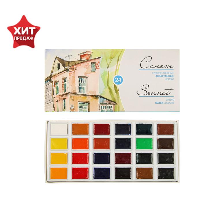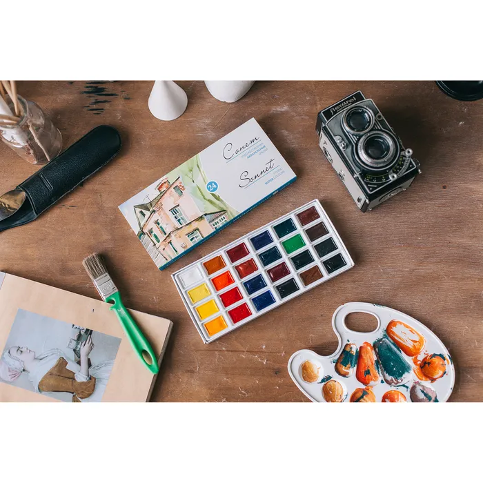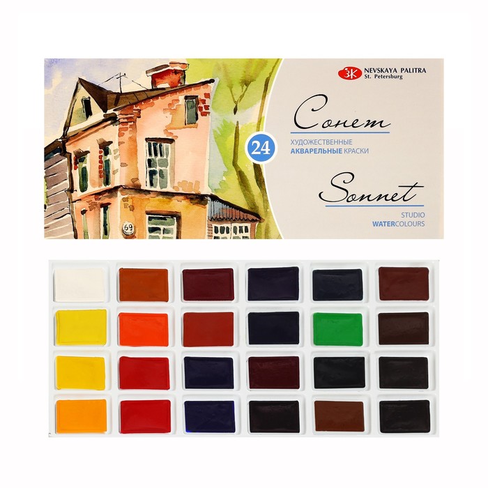 Художественные акварельные краски "Сонет" разработаны для начинающих художников, открывающих или совершенствующих свои творческие способности. Изготавливаются по современным рецептурам на основе преимущественно органических пигментов и синтетического связующего. Обладают интенсивностью цвета и прозрачностью. Превосходно смешиваются, размываются и легко берутся на кисть. Тщательно подобранная палитра из 24 цветов акварельных красок "Сонет" позволяет решить множество творческих задач начинающего художника при выполнении учебных работ, этюдов и эскизов.