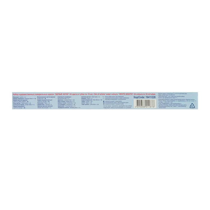 Профессиональные художественные акварельные краски "Белые ночи" представляют собой тонкодисперсные суспензии пигментов и наполнителей в связующем, в состав которого входит водный раствор растительного клея – гуммиарабика. Все акварельные краски в палитре "Белые ночи" безопасны, сертифицированы и соответствуют стандартам ASTM D-4236. Высокая концентрация пигмента обеспечивают максимальную интенсивность цветового тона акварели. Насыщенность сохраняется даже при разбавлении большим количеством воды. Отличаются прозрачностью, что дает возможность художнику работать тонкими лессировками. Чистые цвета позволяют писать в смесях и получать богатое многообразие оттенков. Основная часть красок обладает высочайшим показателем светостойкости, что способствует сохранности работ свыше 100 лет. Все это обеспечивает их высокое качество и возможность использования в ответственных работах. Краски в тубах обладают пастообразной консистенцией, не требуют дополнительного размачивания водой и сразу готовы к применению. Рекомендуются для живописи на больших форматах, для смешивания красочных растворов, для заливок больших участков бумаги, для заполнения пустых кювет. Сбалансированная палитра из 24 цветов в наборе "Белые ночи" позволяет решить множество творческих задач акварелиста. Набор представлен в пластиковом коррексе и картонном чехле.