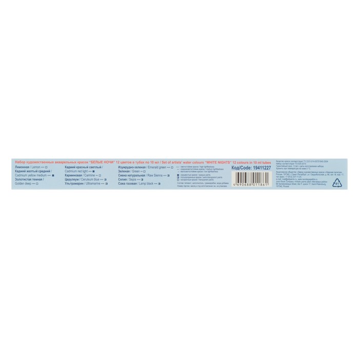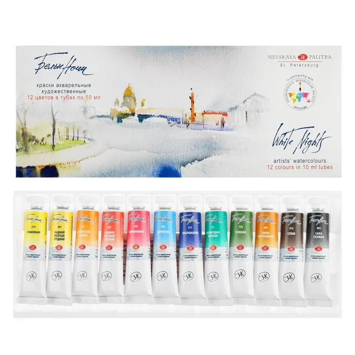 Профессиональные художественные акварельные краски "Белые ночи" представляют собой тонкодисперсные суспензии пигментов и наполнителей в связующем, в состав которого входит водный раствор растительного клея – гуммиарабика. Все акварельные краски в палитре "Белые ночи" безопасны, сертифицированы и соответствуют стандартам ASTM D-4236. Высокая концентрация пигмента обеспечивают максимальную интенсивность цветового тона акварели. Насыщенность сохраняется даже при разбавлении большим количеством воды. Отличаются прозрачностью, что дает возможность художнику работать тонкими лессировками. Чистые цвета позволяют писать в смесях и получать богатое многообразие оттенков. Основная часть красок обладает высочайшим показателем светостойкости, что способствует сохранности работ свыше 100 лет. Все это обеспечивает их высокое качество и возможность использования в ответственных работах. Краски в тубах обладают пастообразной консистенцией, не требуют дополнительного размачивания водой и сразу готовы к применению. Рекомендуются для живописи на больших форматах, для смешивания красочных растворов, для заливок больших участков бумаги, для заполнения пустых кювет. Палитра набора "Белые ночи" состоит из 12 основных цветов, необходимых художнику для создания акварельных работ. Набор представлен в пластиковом коррексе и картонном чехле.