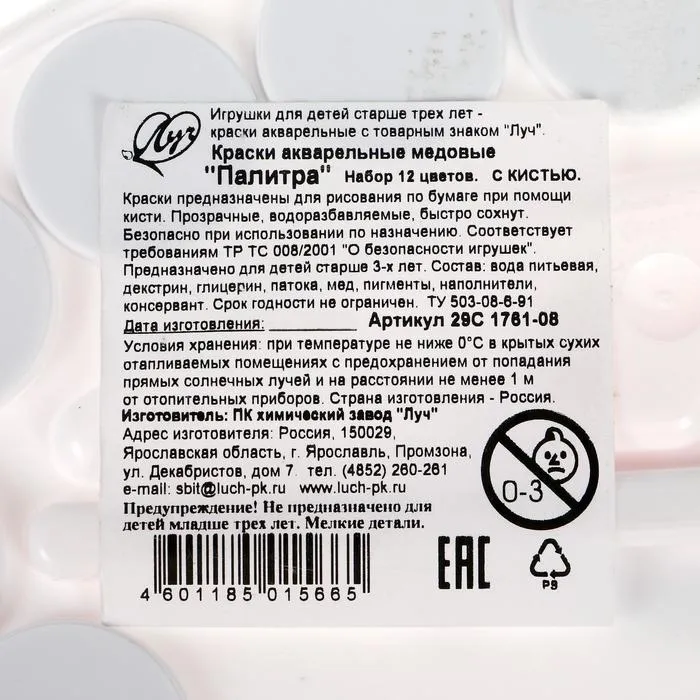 Высококачественная краска для детского творчества, изготовленная по классической рецептуре. В акварели есть мёд, что значительно улучшает её качество и внешний вид. Прекрасно размывается и разносится по поверхности бумаги, легко наполняясь на кисть. Краски смешиваются между собой, сохраняя насыщенность цвета без вкраплений. Большое количество краски в кюветах. Краска легко смывается с рук и одежды. Безопасна для детей