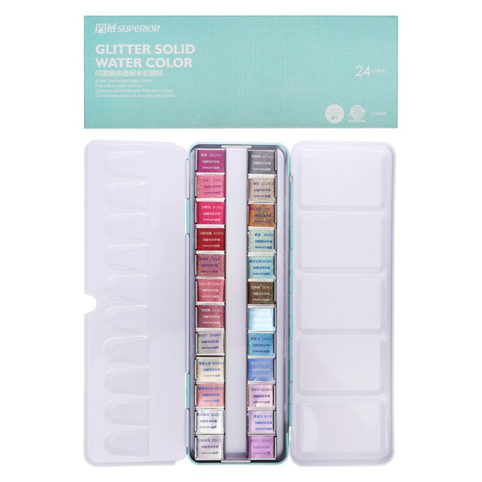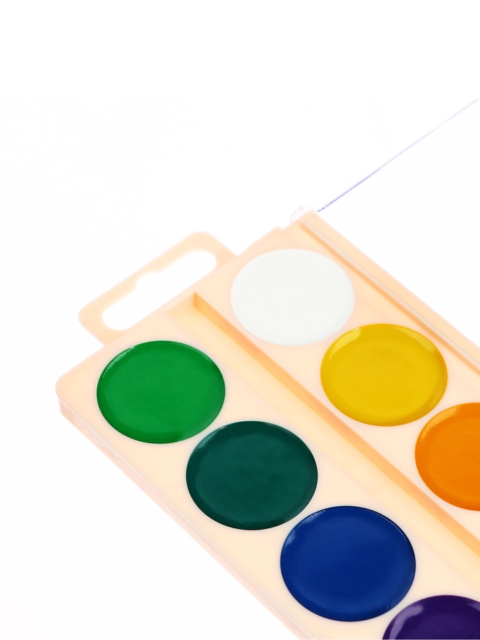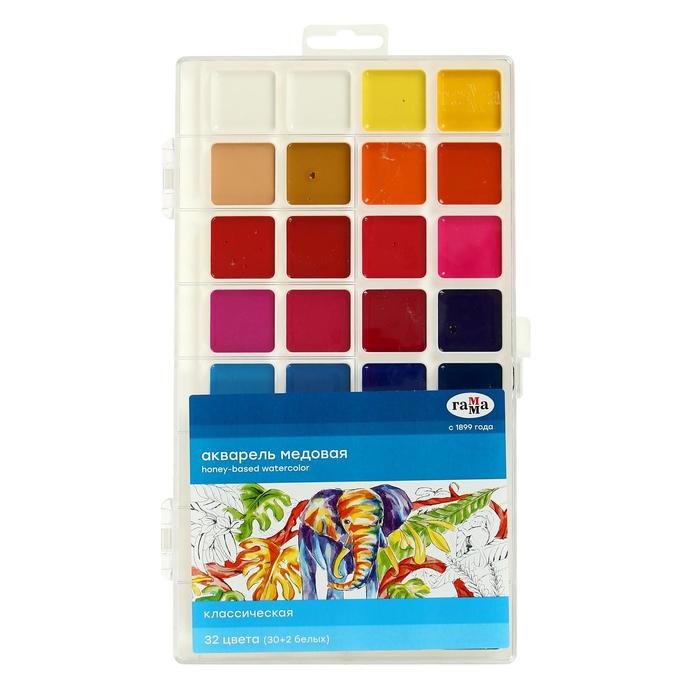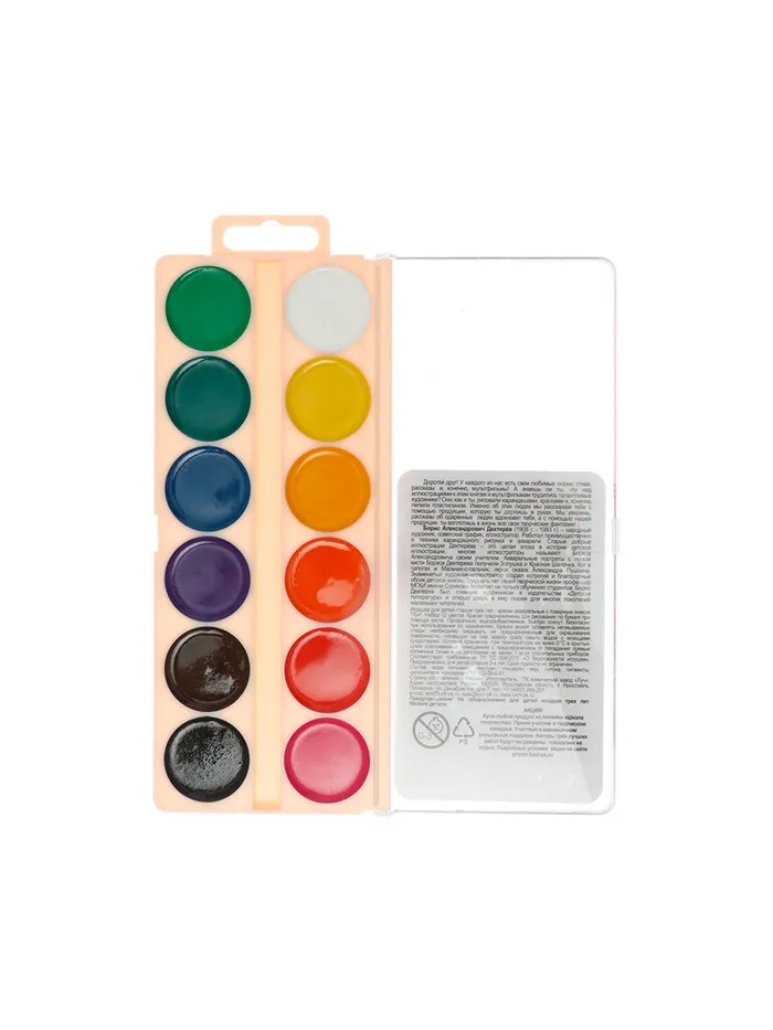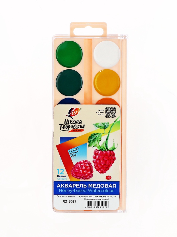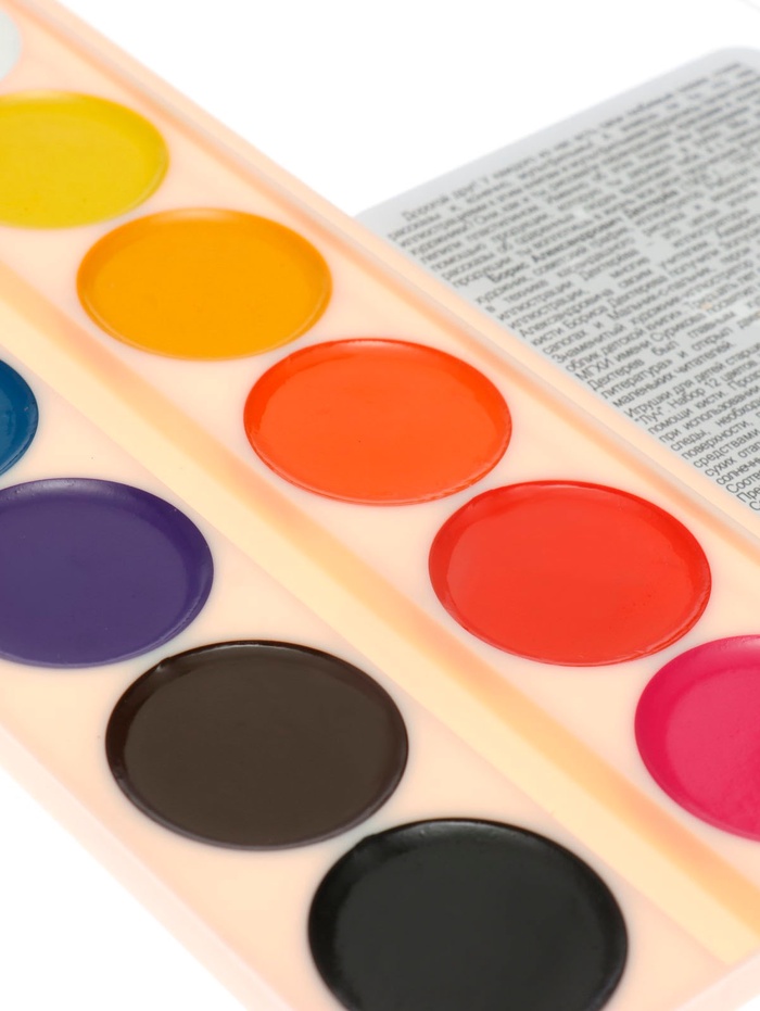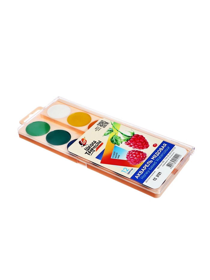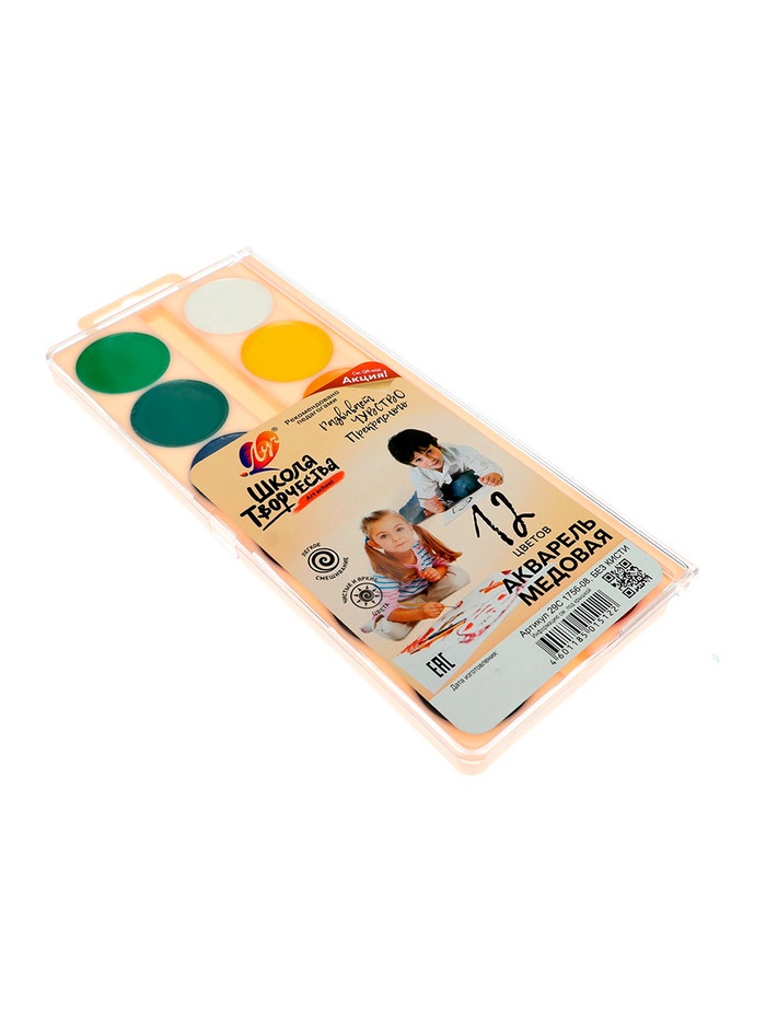 Медовая акварель изготовленная по классической рецептуре с яркими и чистыми цветами. Краска в подложке расположена группами: холодные-тёплые оттенки. Прекрасно размывается и разносится по поверхности бумаги, имея прозрачную основу без вкраплений. Краски смешиваются между собой, сохраняя насыщенность цвета. Краска легко смывается с рук и одежды.