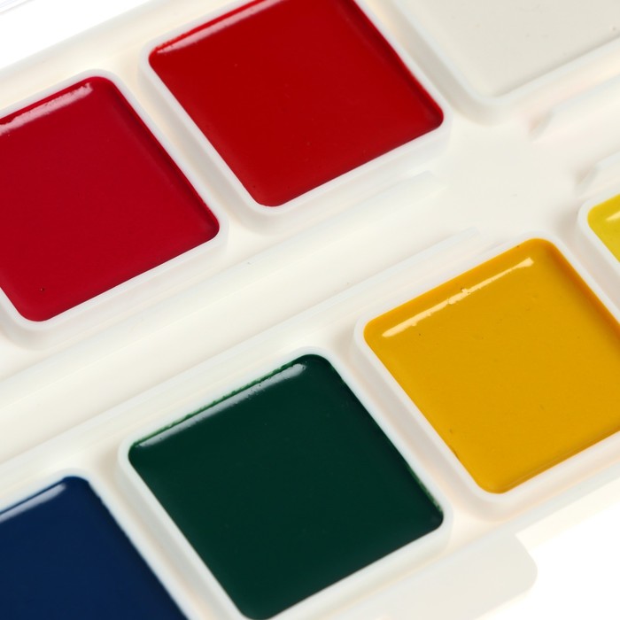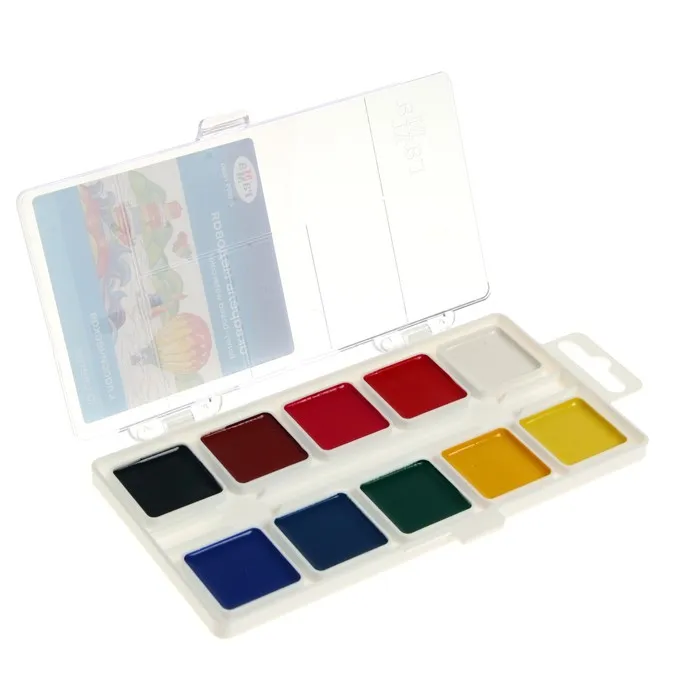 Цвета акварели яркие, чистые и насыщенные благодаря качественному прозрачному связующему. Все краски расположены на одной подложке, словно на палитре настоящего художника.