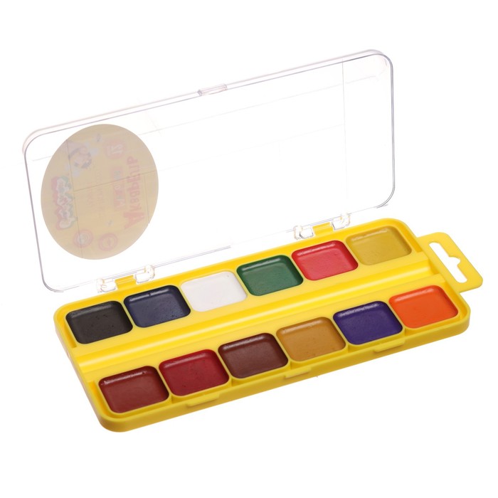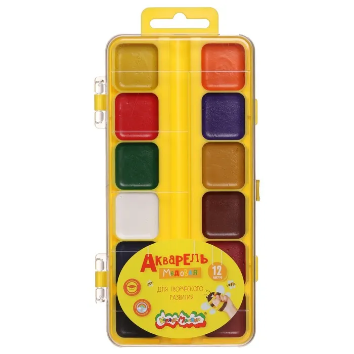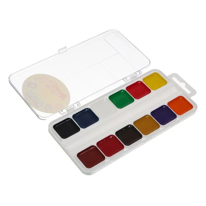 Акварель безопасна для детей. Удобный пластиковый пенал, крышка плотно фиксируется и служит палитрой для смешивания красок.