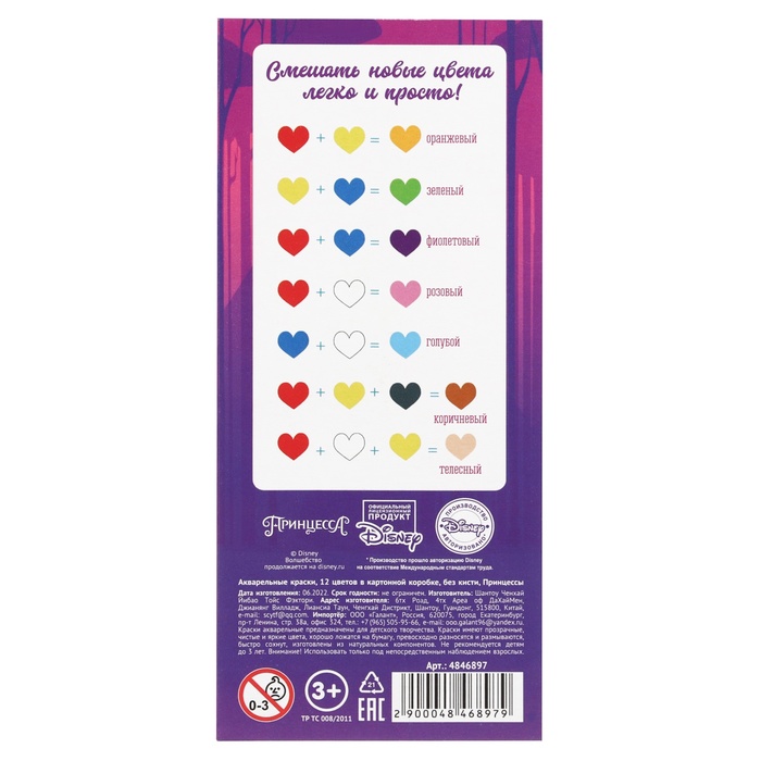 Акварель медовая «Принцессы», 12 цветов, в картонной коробке, без кисти — Характеристики