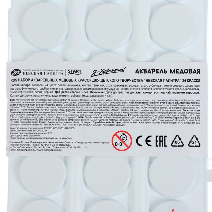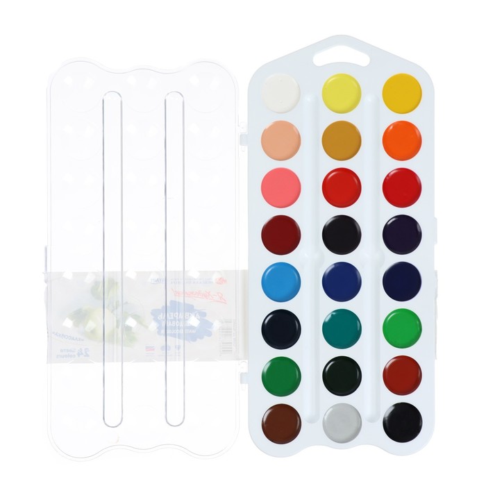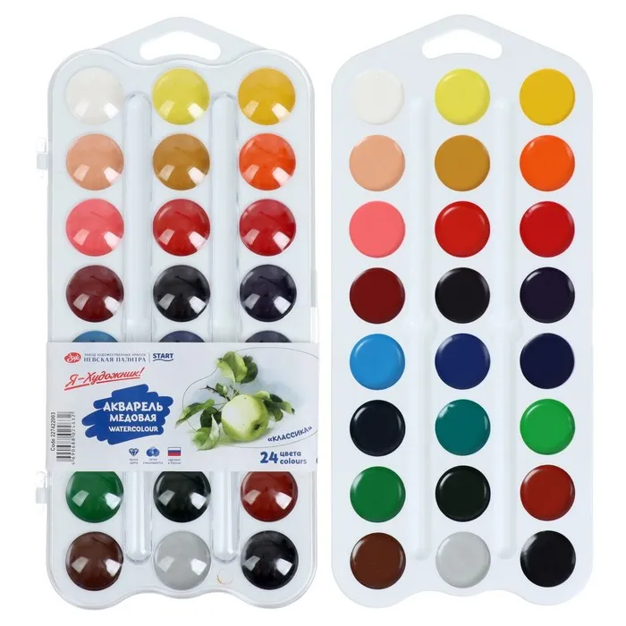 В составе набора медовой акварели 24 базовых цвета. Набор выпускается в пластиковом пенале небольшого размера, что позволяет значительно экономить место в рюкзаке. Крышку упаковки можно использовать в качестве палитры. Поскольку производителем является признанный лидер в производстве профессиональных художественных материалов, акварельные краски "Я-Художник!" отличаются высокой чистотой цвета и яркостью. Даже при нанесении тонкого слоя краски цвет рисунка получается ярким, и что особенно важно для детей – не меняет свой цвет после высыхания. Краски легко набираются на влажную кисть и легко разносятся, ровно ложатся на бумагу. Тонкость перетира пигмента обеспечивает нанесение краски без образования точек и пятен. После высыхания краски не растрескиваются вне зависимости от толщины нанесенного слоя.