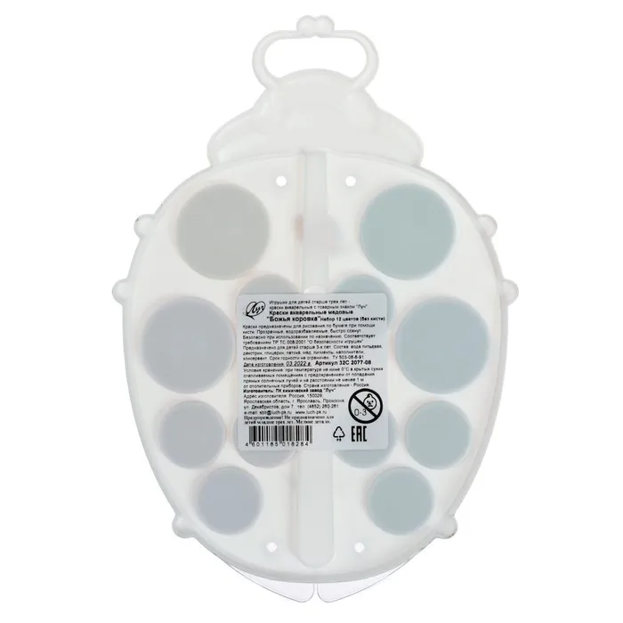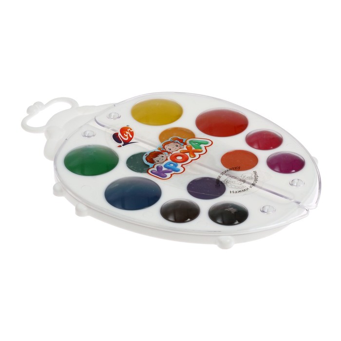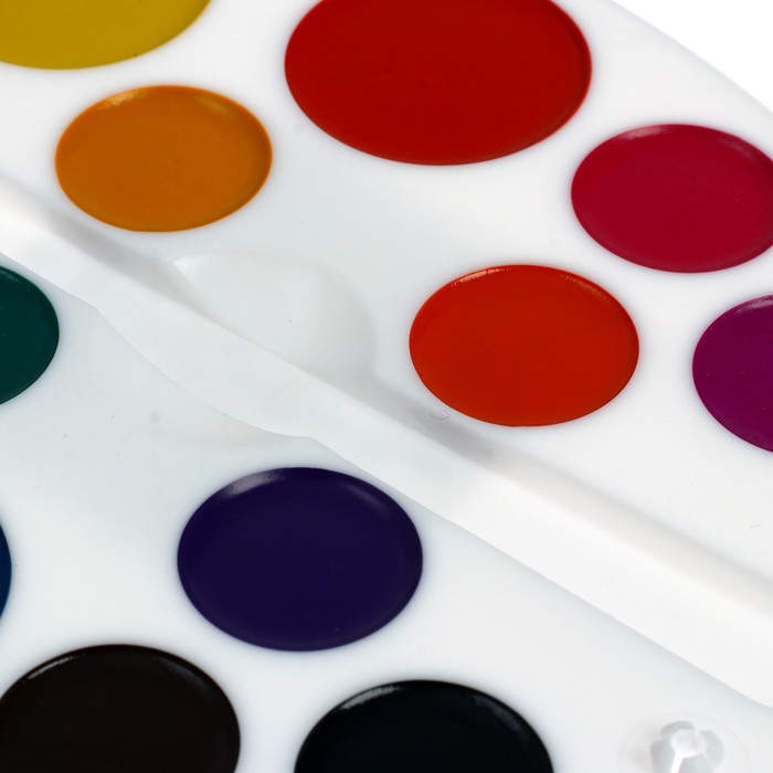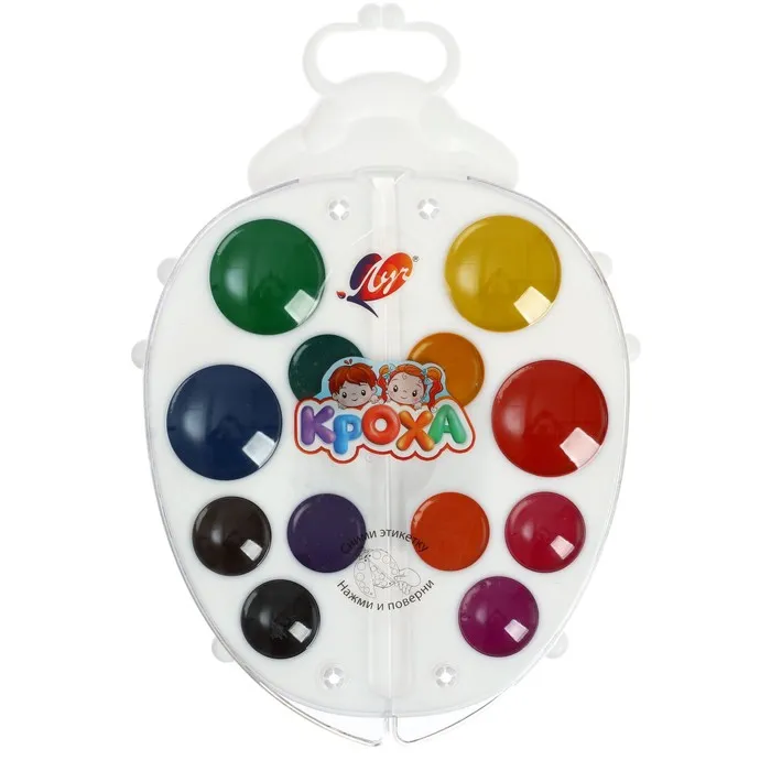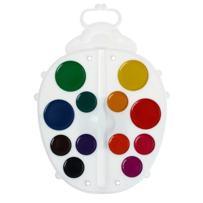 Акварель безопасна для детей. Удобный пластиковый пенал, крышка плотно фиксируется и служит палитрой для смешивания красок.