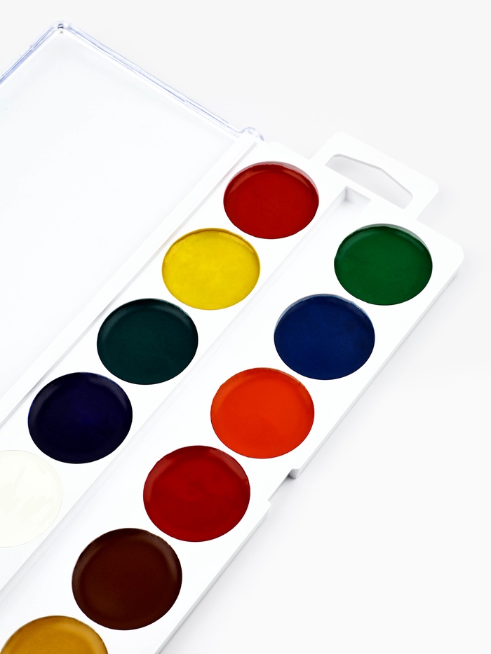 Набор акварельных красок для художественного творчества .Краски изготовлены по специальной технологии на основе минеральных наполнителей с добавлением натуральных пластификаторов .