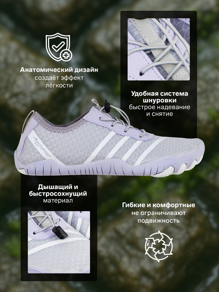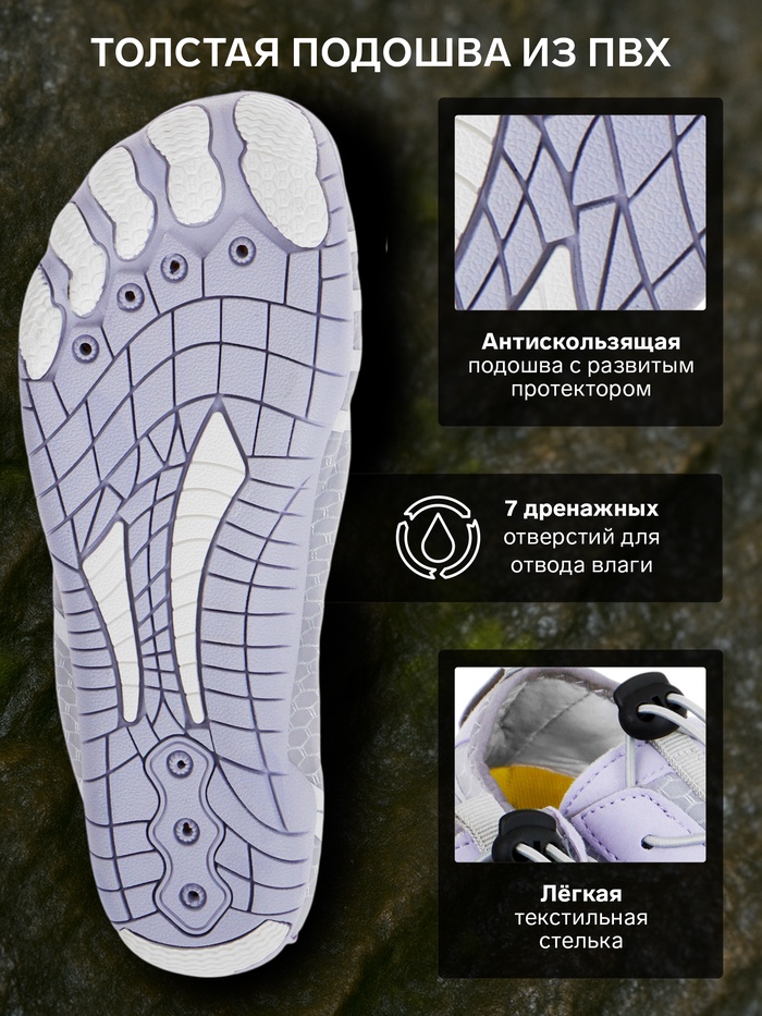 Специальные отверстия на подошве не задерживают воду внутри обуви и обеспечивают хорошую вентиляцию. Аквашузы быстро сохнут.