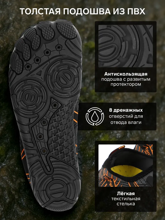 Специальные отверстия на подошве не задерживают воду внутри обуви и обеспечивают хорошую вентиляцию. Аквашузы быстро сохнут.