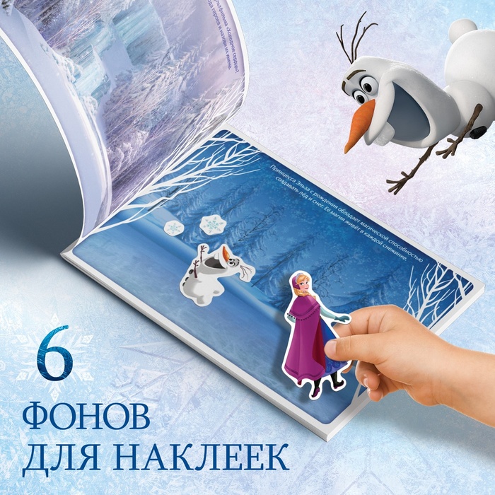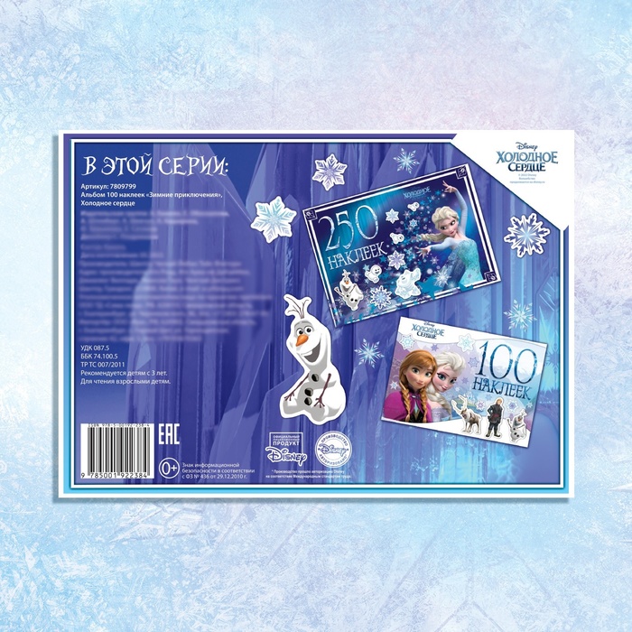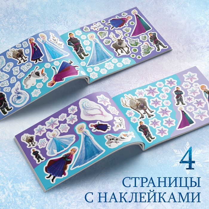 - В альбоме представлено 100 тематических наклеек с красочными изображениями героев мультфильма «Холодное сердце».