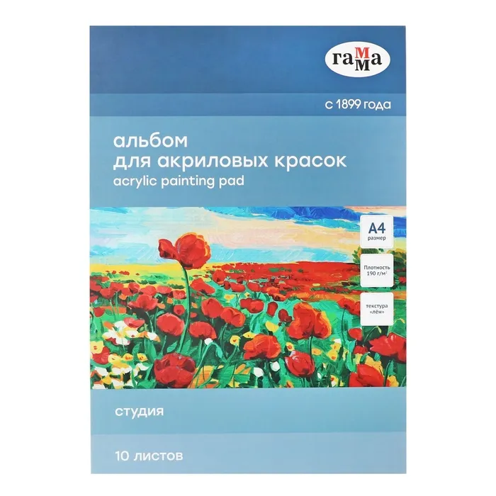 Альбом для акрила ГАММА серии «Студия» формата А4 плотностью 190 г/м2, текстура "лен". Альбом представляет собой склейку по короткому краю высококачественной бескислотной бумаги ,основу которой составляет 100% целлюлоза. Бумага обладает естественным белым цветом, текстурой льна. Обладает высокой степенью адгезии и не требует дополнительной подготовки. Бумага рекомендуется для водорастворимых красок – акрила, гуаши, темперы. Альбом на склейке с картонной плотной подложкой , что позволяет использовать альбом "на весу" как планше.