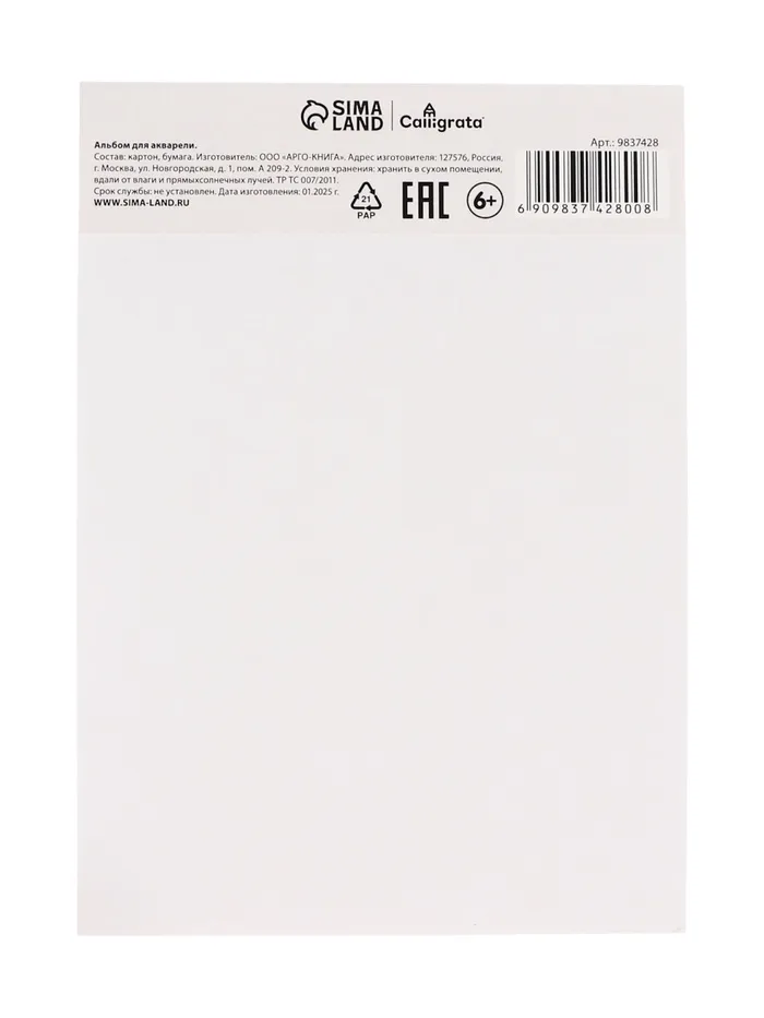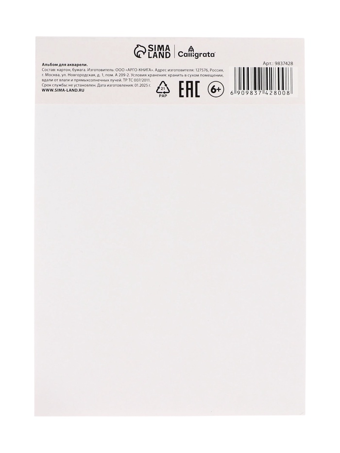 Альбом для акварели А4, 24 листа на склейке Calligrata, обложка мелованный картон, блок рисовальная бумага 180 г/м² — Характеристики