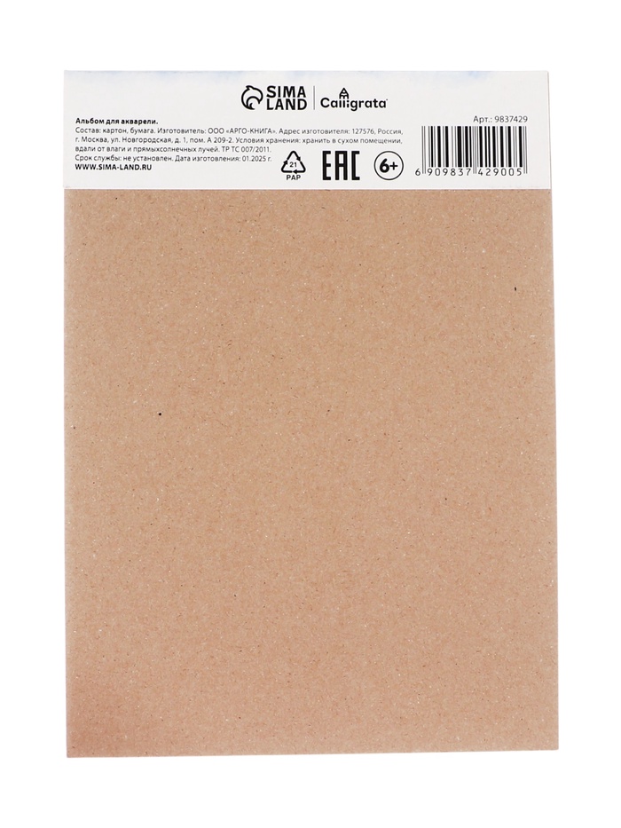 Альбом для акварели Calligrata, А4, 40 листов, на склейке, обложка мелованный картон, жёсткая подложка, блок 180 г/м² — Характеристики