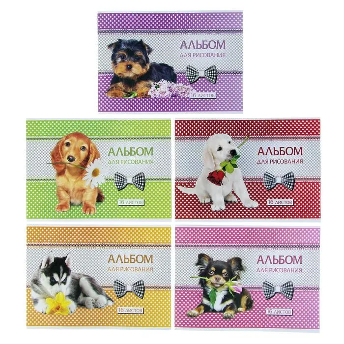 Альбом для рисования А4, 16 листов, на скрепке, "Щенки", обложка мелованный картон, блок 100 г/м², перфорация на отрыв, МИКС — Характеристики