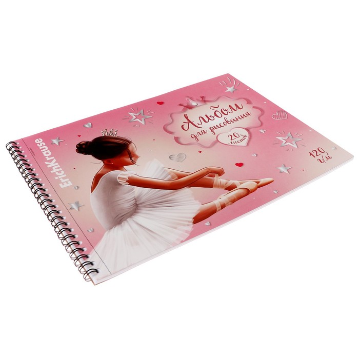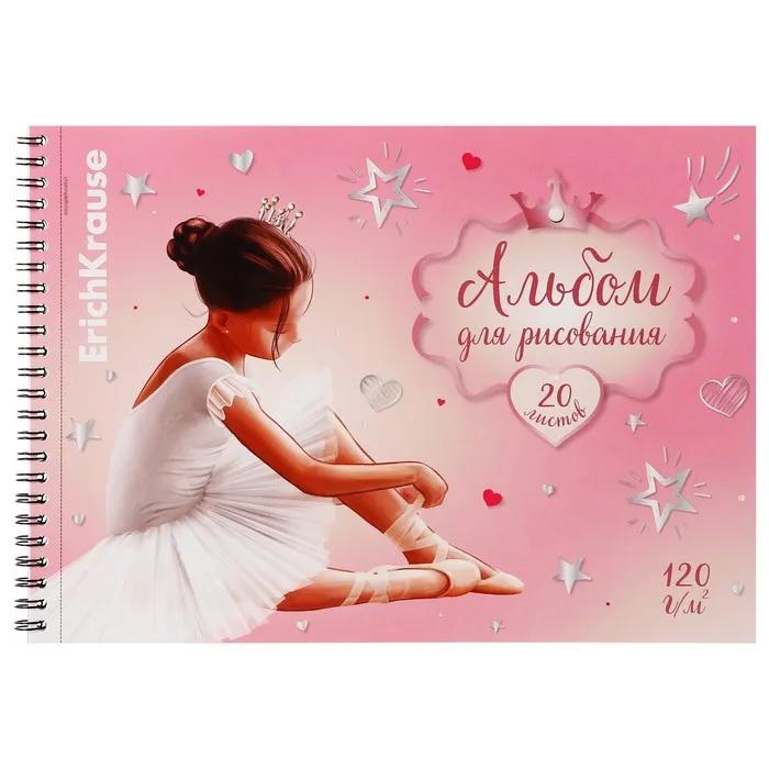 Альбом для рисования формата А4 (210х294 мм). Обложка из высококачественного мелованного картона плотностью 170 г/м2. Жесткая подложка 360 г/м2. В блоке 20 листов. Бумага плотностью 120 г/м2. Белизна бумаги - 100%. Микроперфорация для отрыва. Тип скрепления - спираль. Альбомы упакованы в термоусадочную пленку по 10 штук.