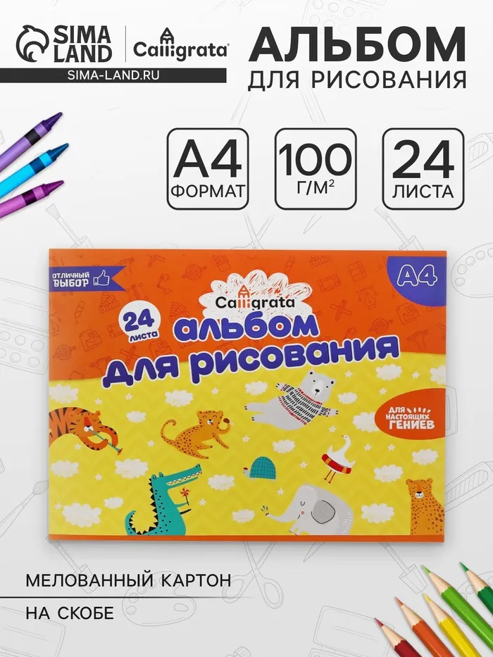 Альбом для рисования А4, 24 листа на скрепке Calligrata, обложка мелованный картон, внутренний блок офсет 100 г/м² — Характеристики