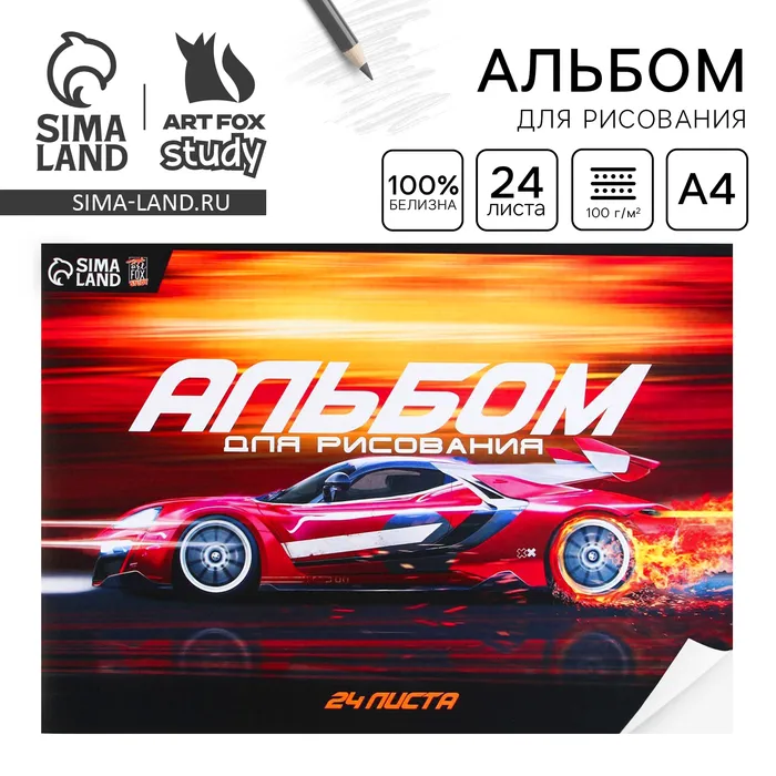 Альбом для рисования А4 24 листа на скрепке «Спорткар» обложка 160 г/м², бумага 100 г/м² — Характеристики