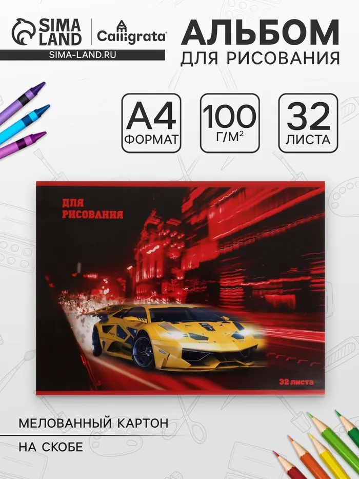 Альбом для рисования А4, 32 листа на скрепке «Авто», обложка мелованная бумага, блок 100 г/м² — Характеристики
