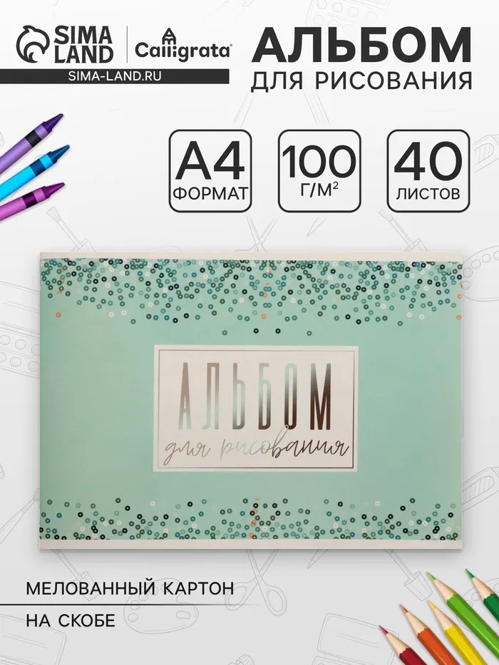 Альбом для рисования А4, 40 листов на скрепке «Голубое сияние», обложка мелованный картон, внутренний блок офсет 100 г/м² — Характеристики