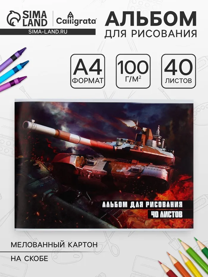 Альбом для рисования А4, 40 листов на скрепке «Танки», обложка мелованная бумага 120 г/м², внутренний блок офсет 100 г/м² — Характеристики