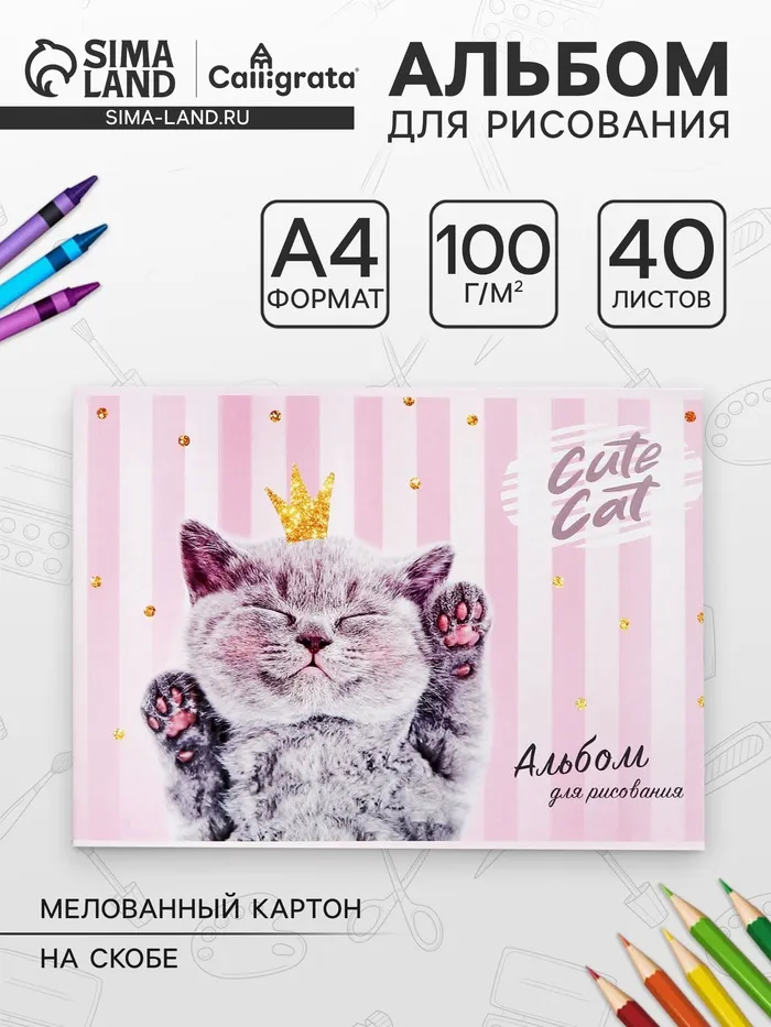 Альбом для рисования Calligrata Cat lady, А4, 40 листов, на скрепке, обложка мелованный картон, блок 100 г/м² — Характеристики