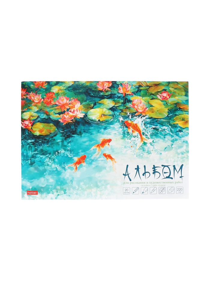 Альбом для рисования и художественных работ А4, 20 листов Hatber «Золотые рыбки», склейка с трёх сторон, обложка мелованная бумага — Характеристики
