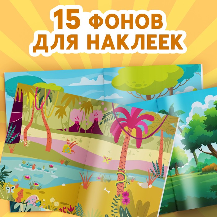 Заполняйте фоны наклейками с доисторическими ящерами и придумывайте интересные сюжетные истории!