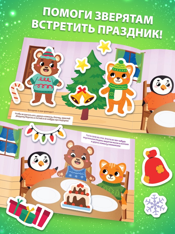 - Каждая страница альбома наполнена различными сценами, где малыш сможет использовать наклейки со зверятами и различными новогодними предметами, чтобы оживить их и создать свои неповторимые истории.