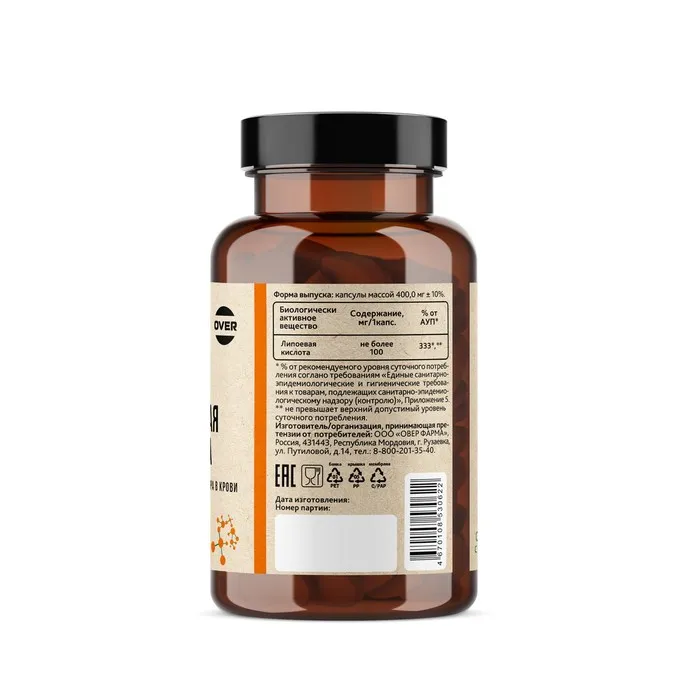 Носитель - микрокристаллическая целлюлоза, альфа - липоевая кислота, твердая желатиновая капсула, агенты антислеживающие: магниевая соль стеариновой кислоты, диоксид кремния аморфный.