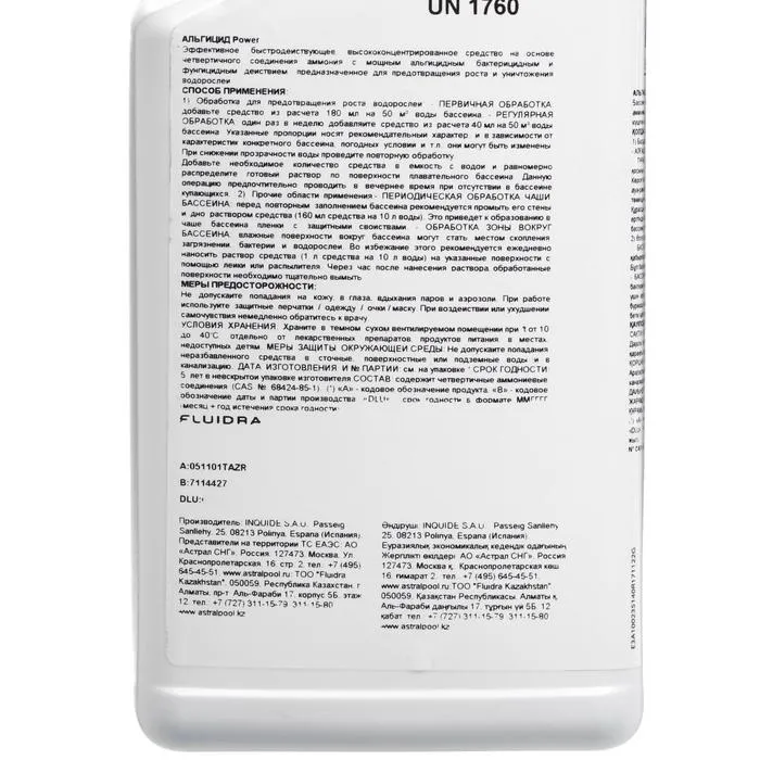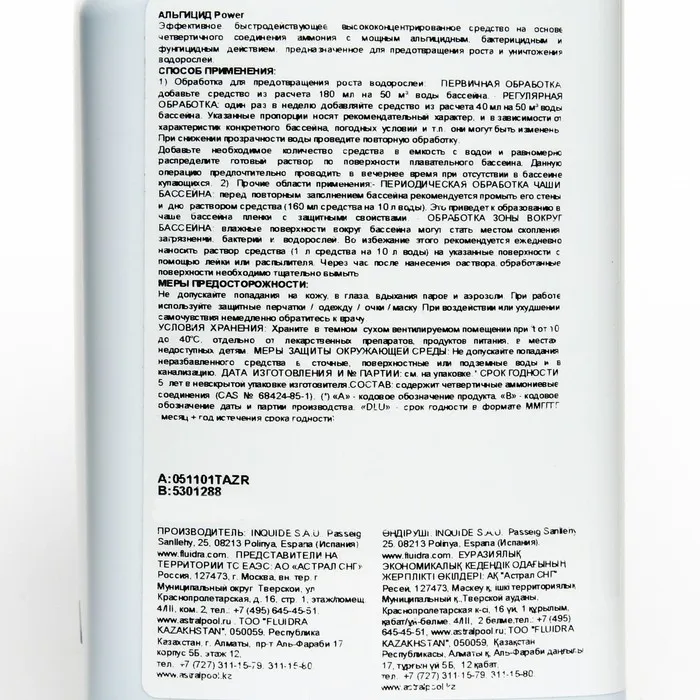 Описание: концентрированный препарат с исключительными альгицидными и фунгицидними свойствами. Препятствует образованию и росту водорослей в бассейне. Революционный дозирующий колпачок позволит вам точно дозировать концентрат, помогая более эффективно расходовать средство.