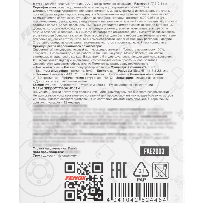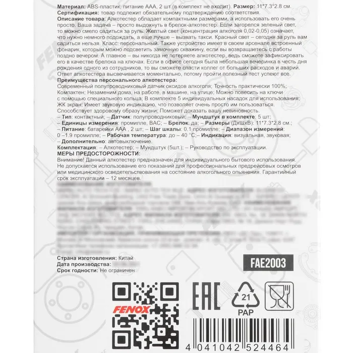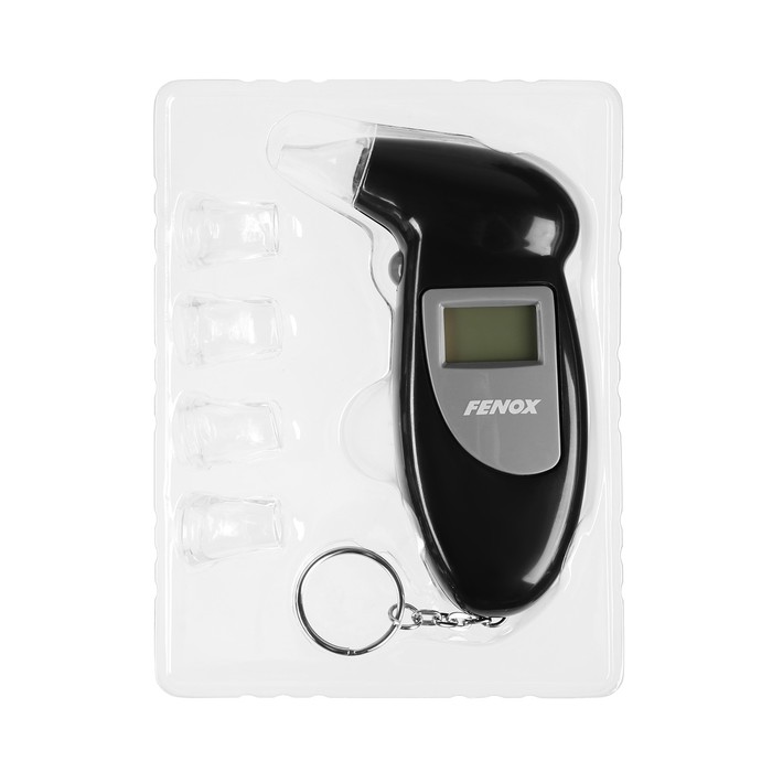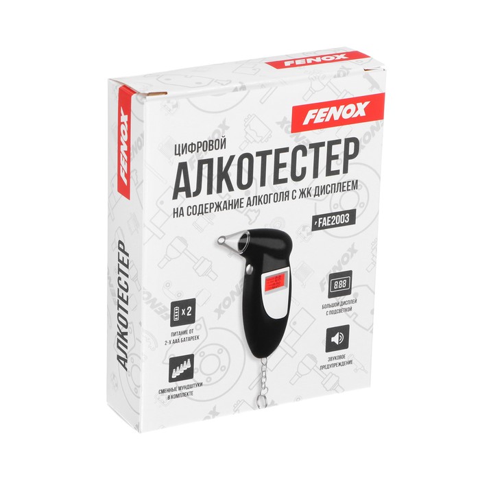 Алкотестер FENOX FAE2003 предназначен для измерения уровня содержания алкоголя в крови. Устройство имеет компактный размер, достаточный, чтобы носить его вместе с ключами, как обычный брелок (для крепления есть специальное крепежное кольцо). Цифровой дисплей с подсветкой позволит моментально получить данные уровня содержания алкоголя. Устройство также оснащено встроенным фонариком и может стать отличным, а главное, полезным подарком для водителей. Функционирует алкотестер FENOX FAE2003 от 2 батареек класса ААА (приобретаются отдельно).