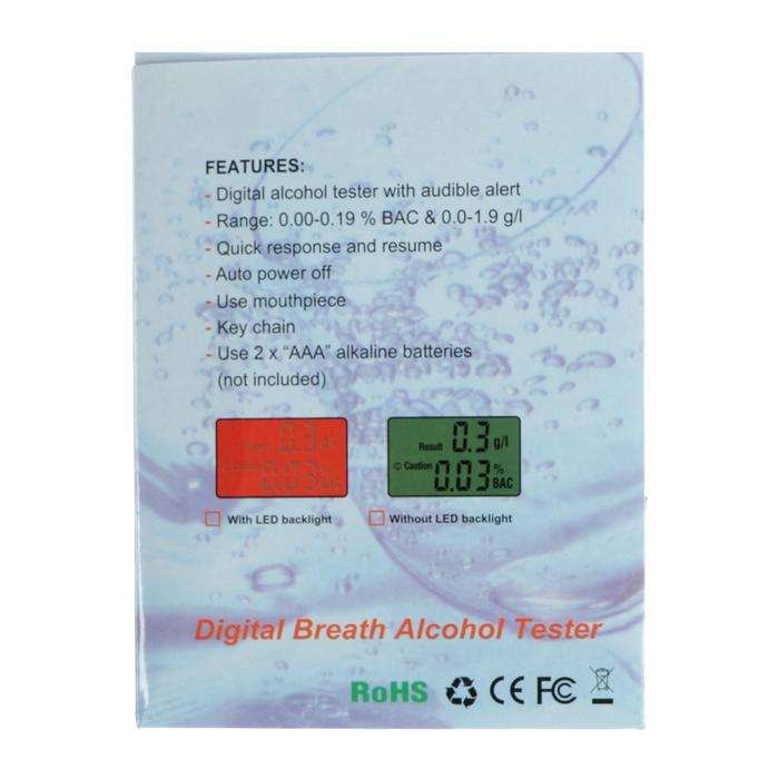 С помощью этого стильного и недорогого алкотестера Вы всегда сможете определить, можно ли садиться за руль. Несомненным преимуществом этой модели является компактность и малый размер, что позволит алкотестер всегда носить с собой, а также хорошо читаемый цифровой светодиодный дисплей для отображения результатов. Алкотестер имеет мундштук.