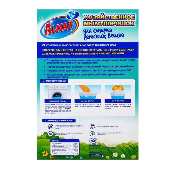 - входящие в состав компоненты на основе натурального мыла легко справляются с любыми загрязнениями, для всех типов тканей, белого и цветного белья;