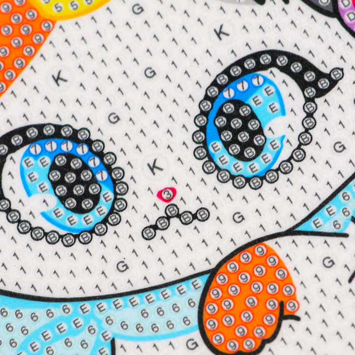 - Разложите кристаллики с помощью карандаша по указанной схеме, заполнив полотно. На картине уже обозначены необходимые оттенки. Холст с клеевым покрытием будет надёжно удерживать стразы.