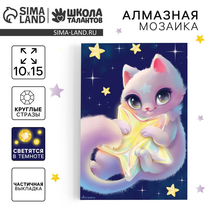 Алмазная мозаика для детей со светящимися стразами «Кошечка на звезде», 10 х 15 см, набор для творчества — Характеристики
