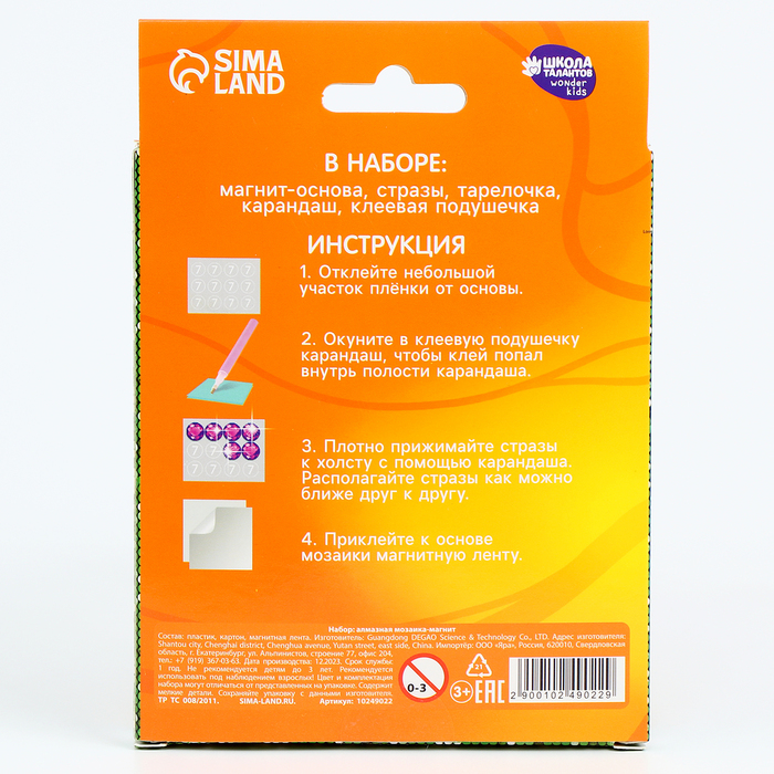 Картонная основа и магнитАлмазные стразы разных цветовКарандаш для стразКлеевая подушечкаЕмкость для стразСоздавая свою уникальную картину с помощью алмазной мозаики, ребенок не только занимается интересным и творческим процессом, но и развивает свою моторику и воображение.