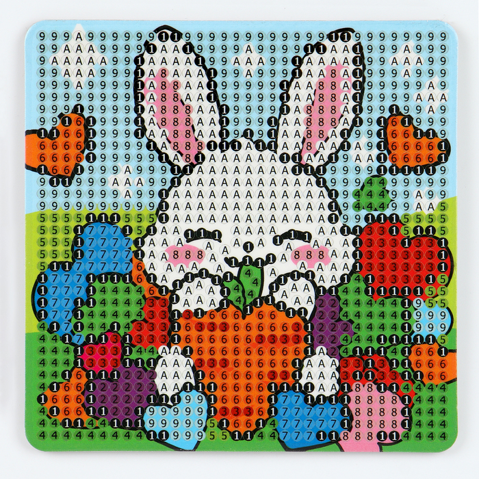 С помощью специального карандаша вам нужно разложить стразы по нарисованной схеме с обозначением необходимых цветов.