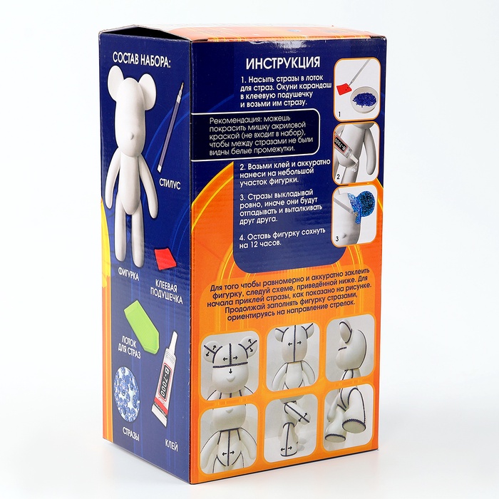 Набор позволит ребёнку смастерить сверкающую игрушку. Малыш с интересом создаст шедевр из ярких страз. Ему понравится не только результат работы, но и сам творческий процесс. Увлекательное занятие поможет развить мелкую моторику рук, усидчивость, внимательность и аккуратность.