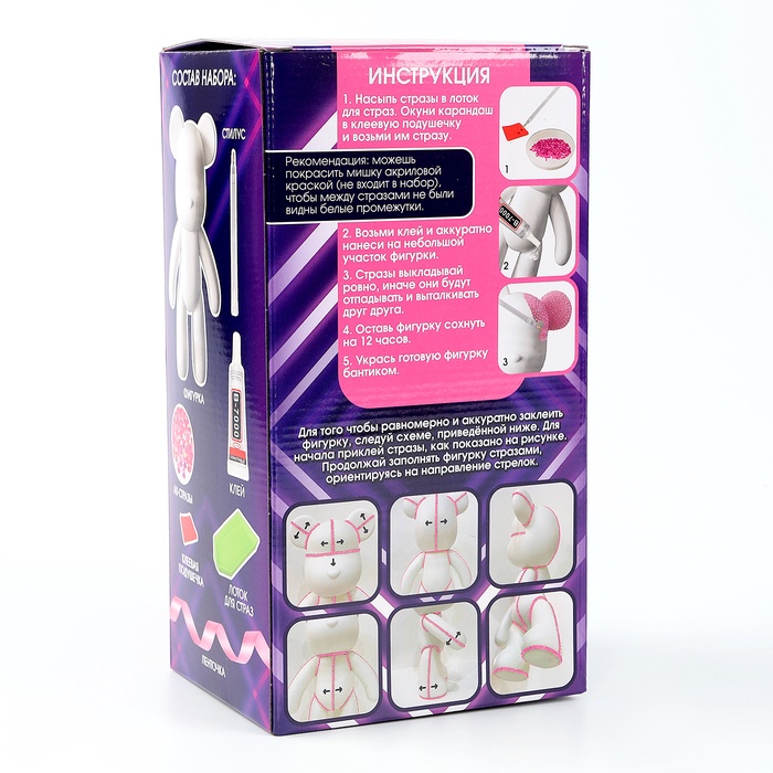 Набор позволит ребёнку смастерить сверкающую игрушку. Малыш с интересом создаст шедевр из ярких страз. Ему понравится не только результат работы, но и сам творческий процесс. Увлекательное занятие поможет развить мелкую моторику рук, усидчивость, внимательность и аккуратность.