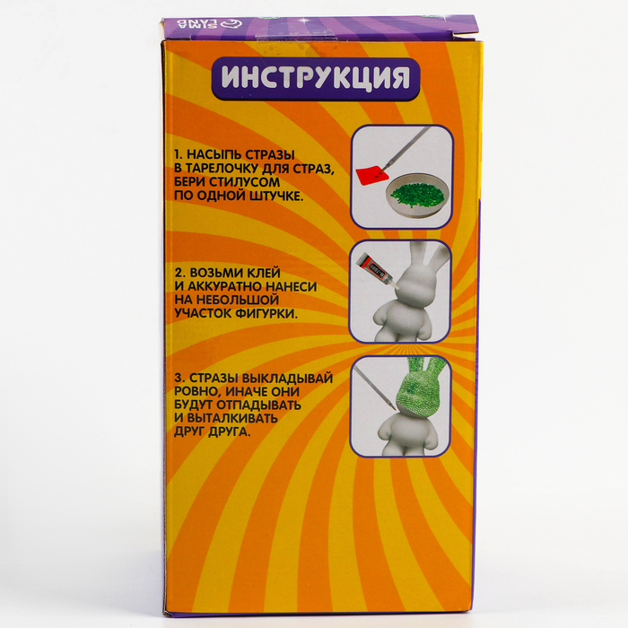 Набор позволит ребёнку смастерить сверкающую игрушку. Малыш с интересом создаст шедевр из ярких страз. Ему понравится не только результат работы, но и сам творческий процесс. Увлекательное занятие поможет развить мелкую моторику рук, усидчивость, внимательность и аккуратность.