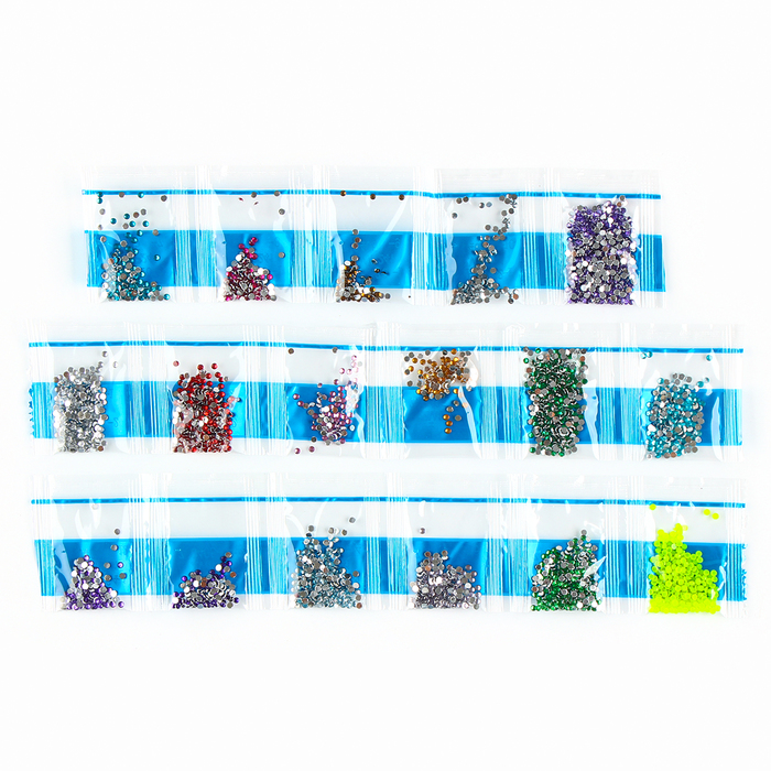 - Из пакетика с номером, который соответствует схеме, отсыпьте в ёмкость немного страз.