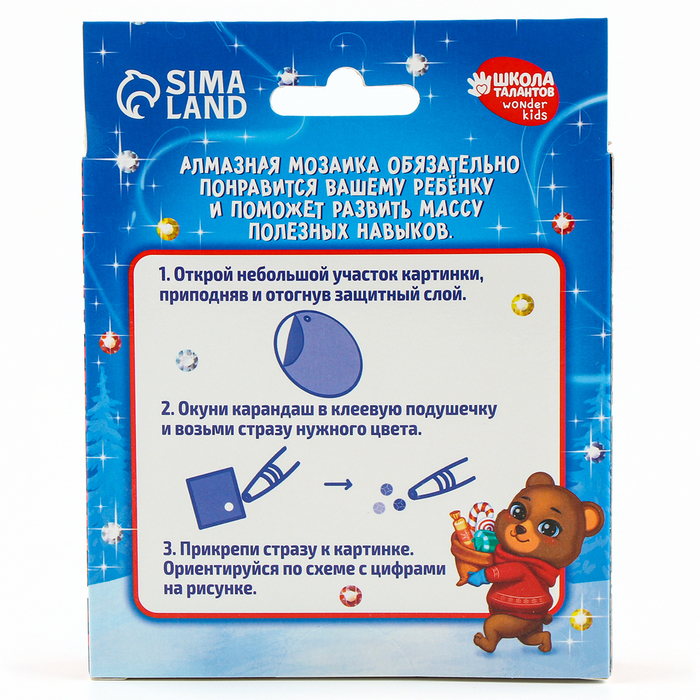 Чтобы получить сверкающую картинку, ребёнку предстоит разложить кристаллики специальным карандашом по схеме. Основа с клеевым покрытием будет надёжно удерживать стразы.