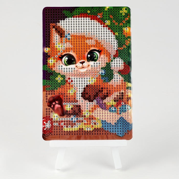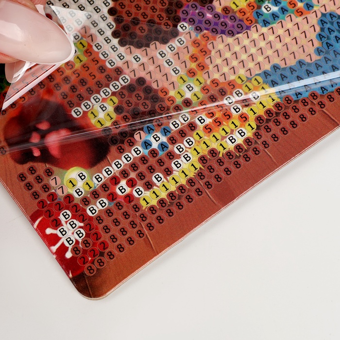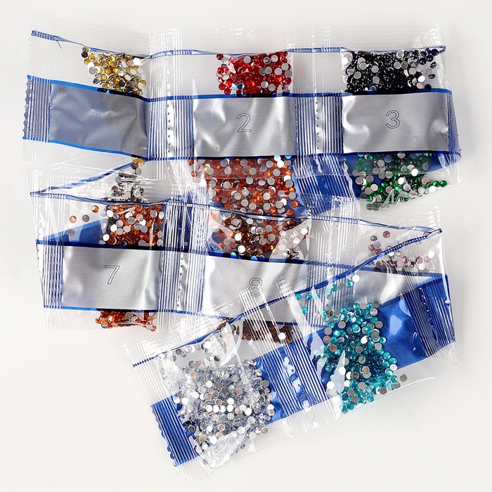 Ребёнку предстоит разложить кристаллики карандашом по пронумерованной схеме, заполнив всё полотно. Основа с клеевым покрытием будет надёжно удерживать стразы. На ней уже обозначены необходимые оттенки.