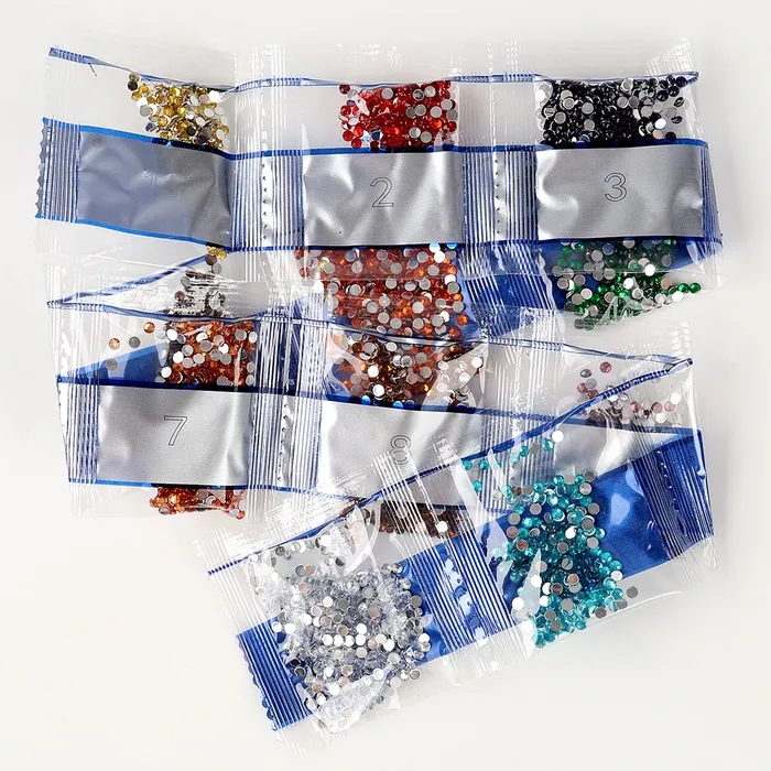 - Из пакетика с номером, который соответствует схеме, отсыпьте в ёмкость немного стразов.