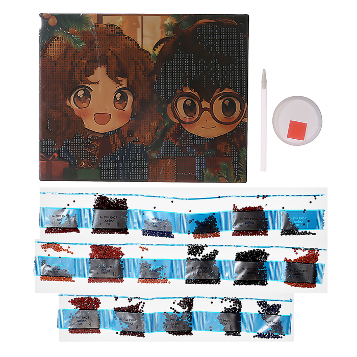 Ребёнку предстоит разложить кристаллики карандашом по пронумерованной схеме, заполнив всё полотно. Холст с клеевым покрытием будет надёжно удерживать стразы.