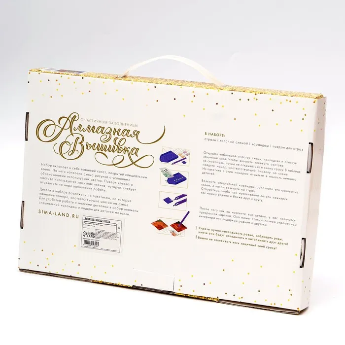 Часть изображения предстоит заполнить стразами, другая часть напечатана на холсте-основе. Поэтому набор подойдёт для тех, кто впервые пробует свои силы в этой технике или любит быстро добиваться результата.