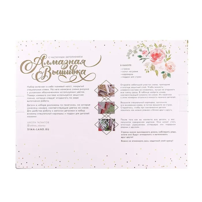 Часть картины предстоит заполнить стразами, другая часть напечатана на холсте-основе — такое изделие легче и быстрее создать. Поэтому набор подойдёт для тех, кто впервые пробует свои силы в этой технике или любит быстро добиваться результата.